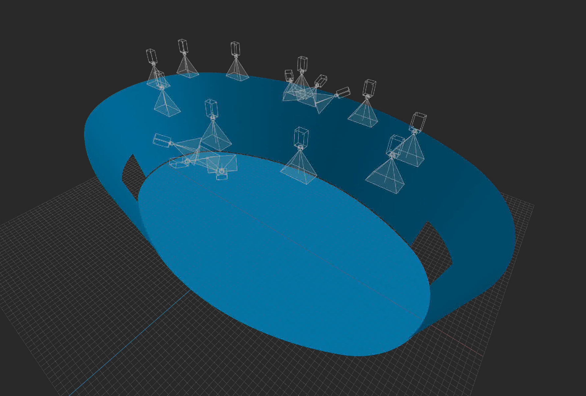 For a space with 16 projectors covering walls and floor, calibration is usually performed with a fisheye camera mounted on the ceiling.